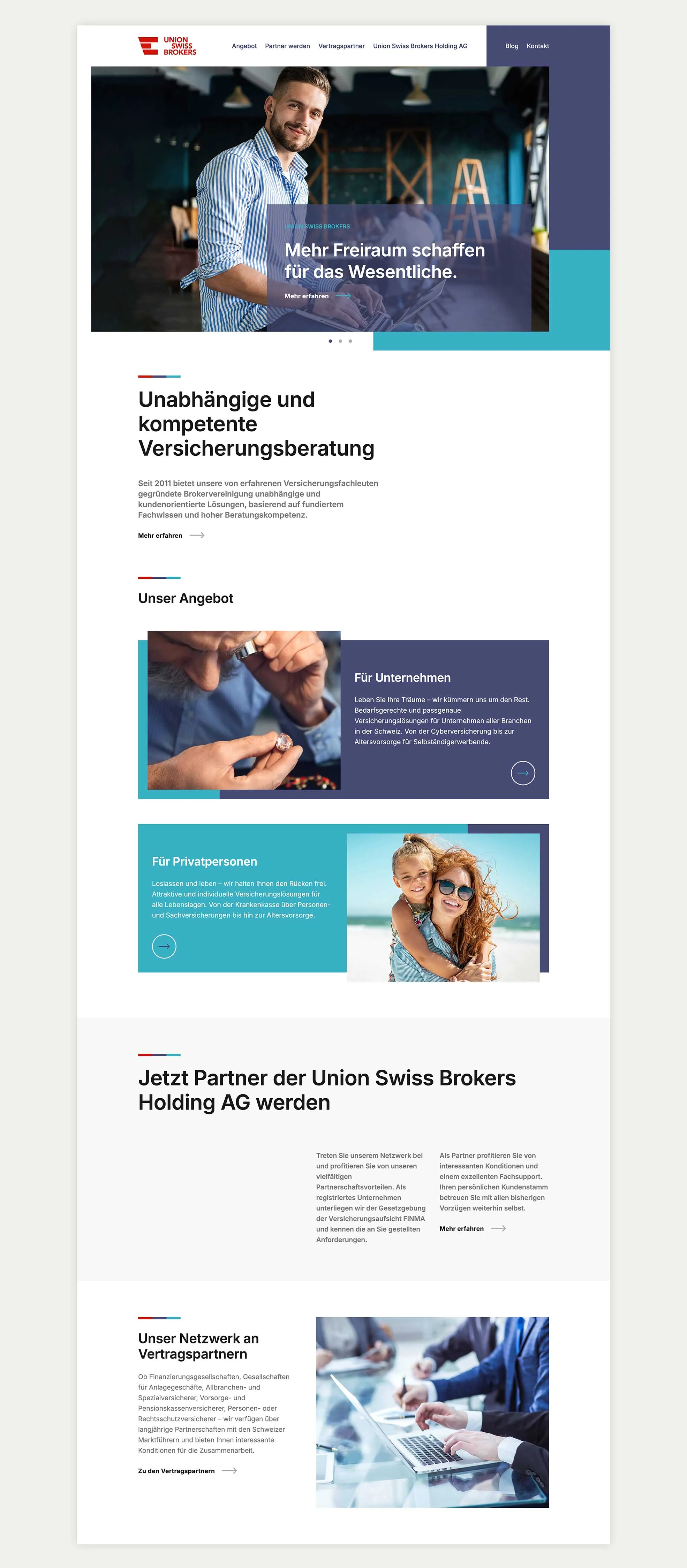Für Union Swiss Brokers haben wir das bestehende Branding strategisch weiterentwickelt und gezielt auf eine erweiterte Zielgruppe ausgerichtet. Eine neue Farbwelt und ein überarbeitetes Bildkonzept verleihen der Marke mehr Strahlkraft und Vertrauen. Auf dieser Basis entstand die neue Corporate Website mit klarer Nutzerführung und einer modernen, authentischen Markenpräsenz.